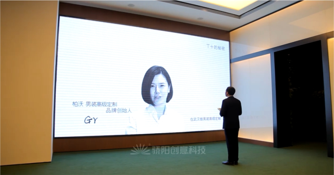 为更好的讲述空间细节,展厅采用占据整个墙面的巨大投影,以拟入驻项目的业主口吻讲述新世界T+值得信赖和选择的若干小秘密。通过内容与形式的完美结合,给予受众仔细倾听的空间氛围。