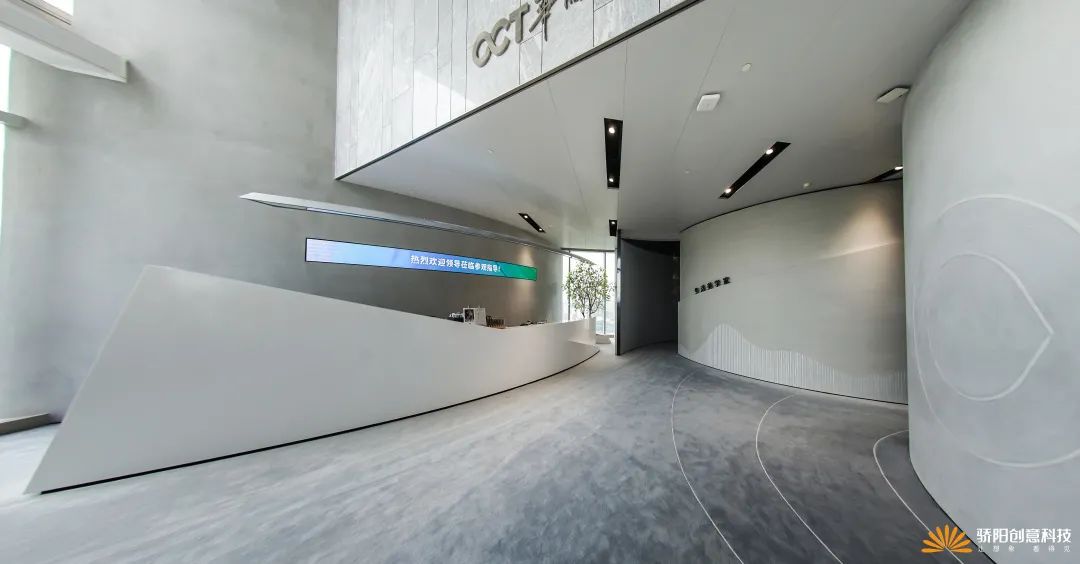 在展区中,为传承展馆的山河理念,我们会通过两面弧墙夹道,呈现出山河的流动感;