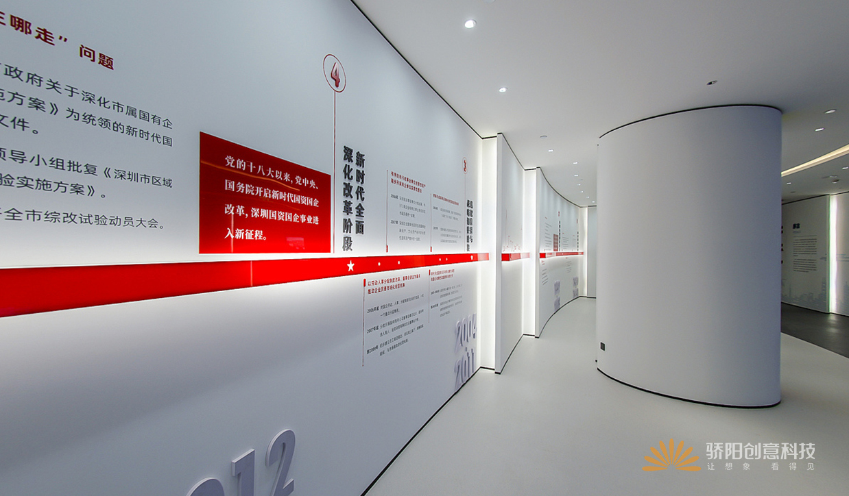 智慧国资管理展示中心项目位于深圳,展厅面积2250m²。整个展厅分为展示区和功能区;展示区主要分为序厅、历程厅、鹏城24小时、成就厅、智慧国资大屏5大板块内容。功能区主要由多功能厅、视频会议室、接待室、休闲区等部分组成。